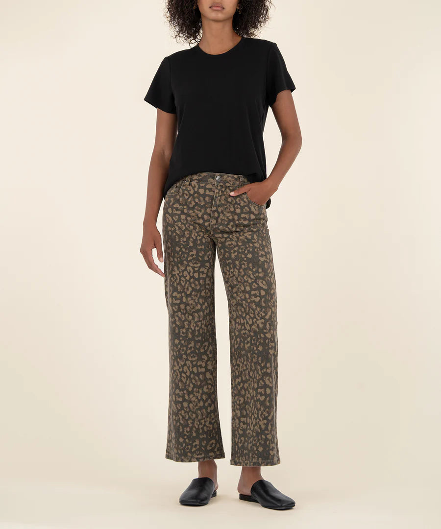 - Own your look in these high rise wide leg pants featuring a bold animal print in rich wood tones. The structured waist flatters while the wide leg brings effortless flow and edge. A statement piece that’s anything but basic.