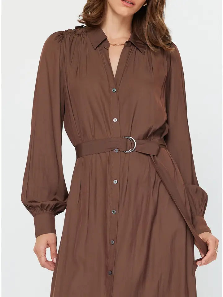 -Long-sleeve -Split neck with shirt collar -Button-down front -Midi length dress with self waist tie -Shoulder shirring detail - Satin-like finish