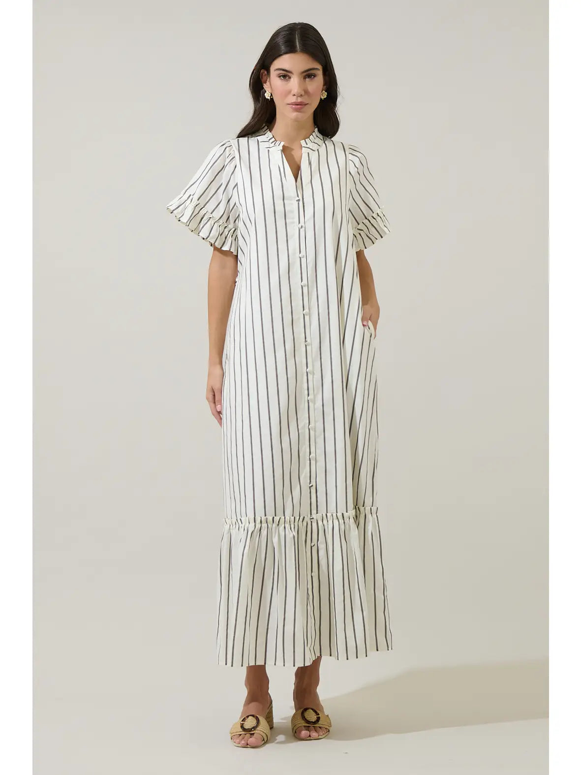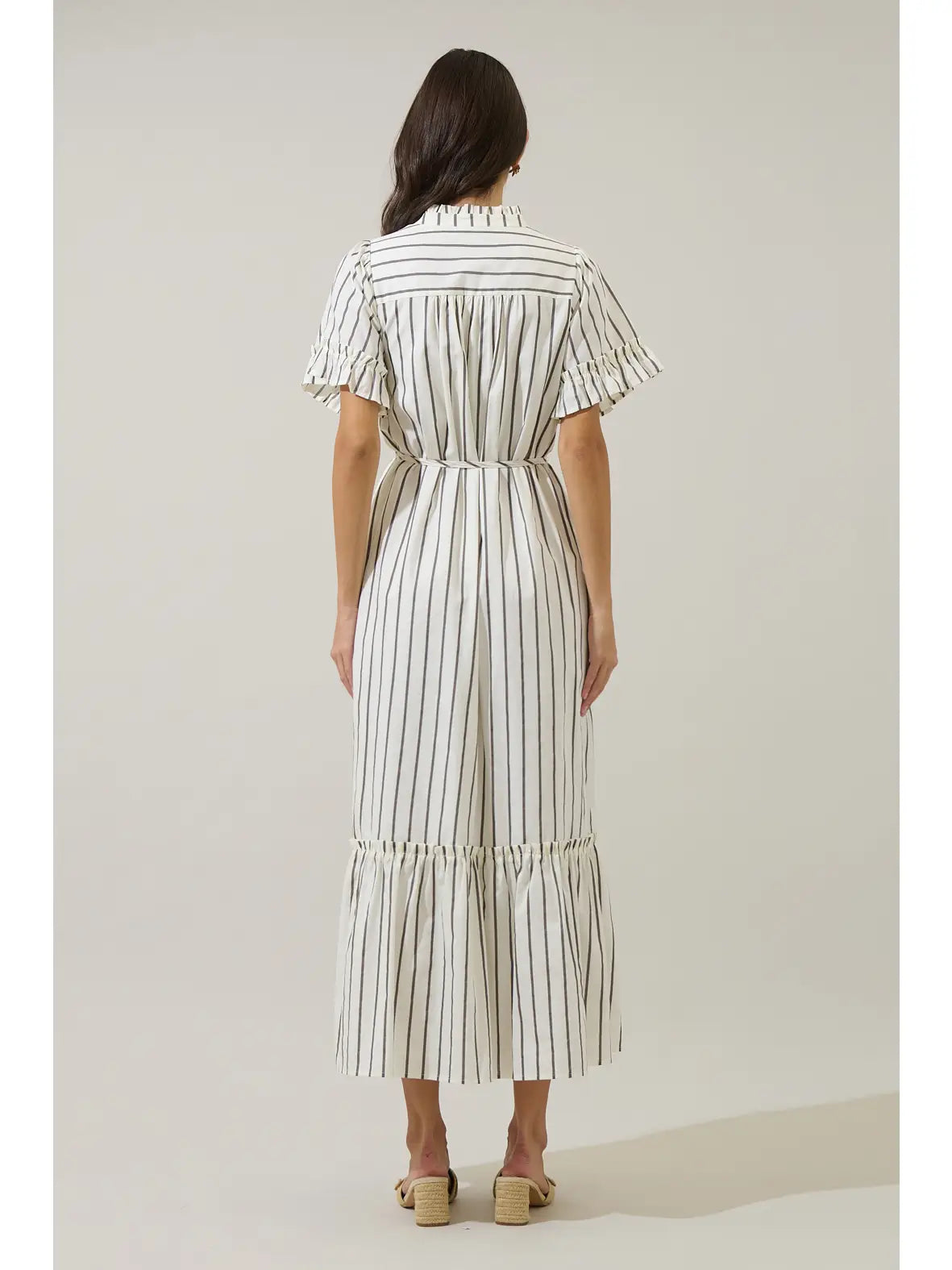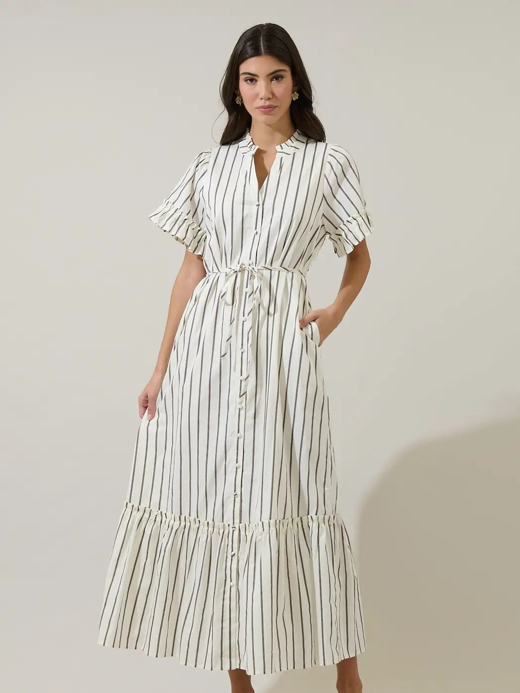 Forget solids, make a statement! This pretty dress has cute stripes and is designed with short ruffle sleeves, a button front, adjustable waist tie, and tiered hem for effortless charm. Perfect for any occasion, just add on your heels or sandals.
