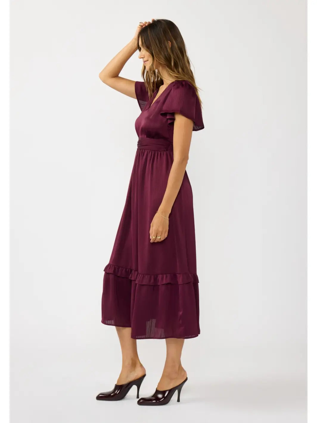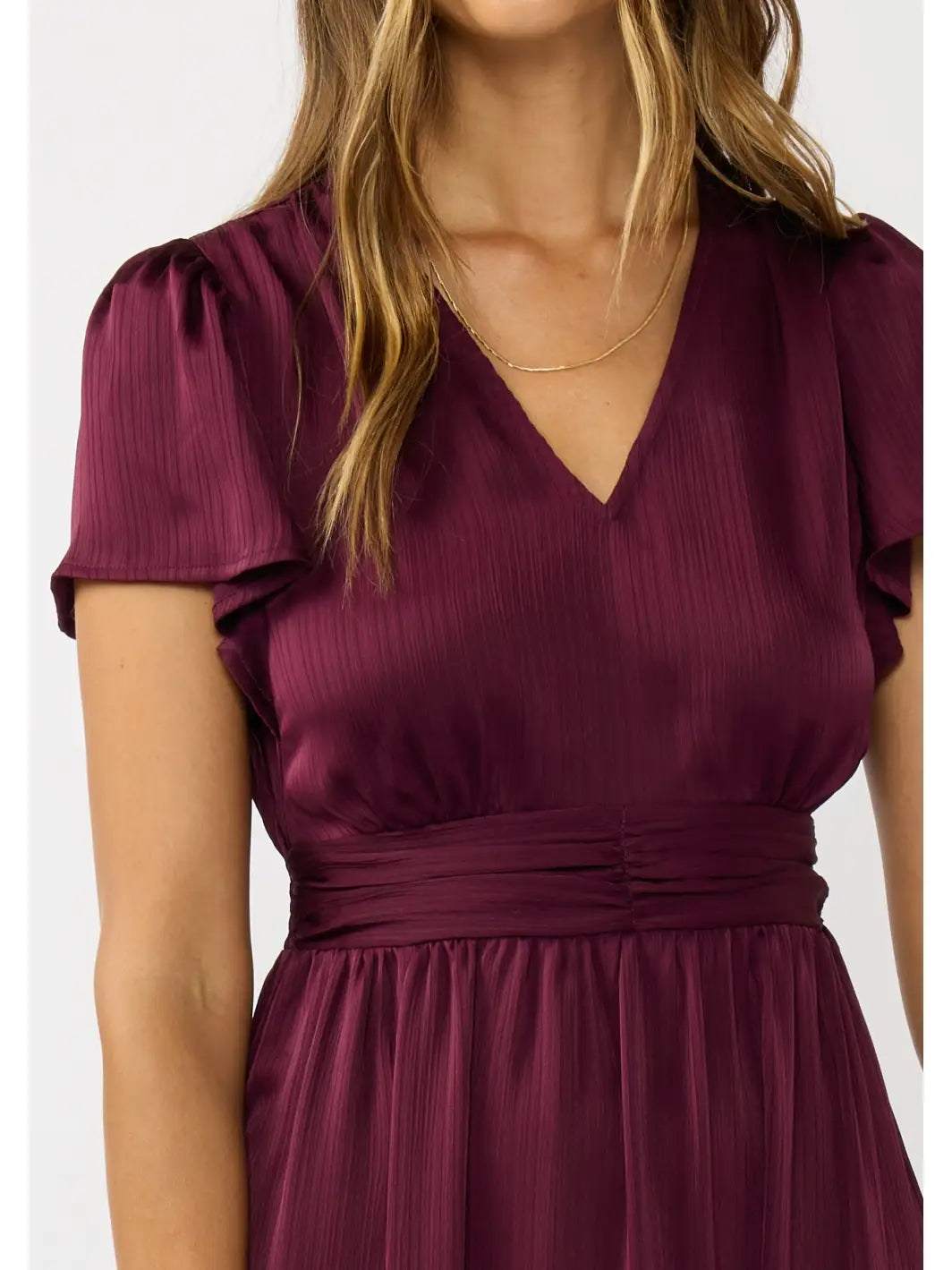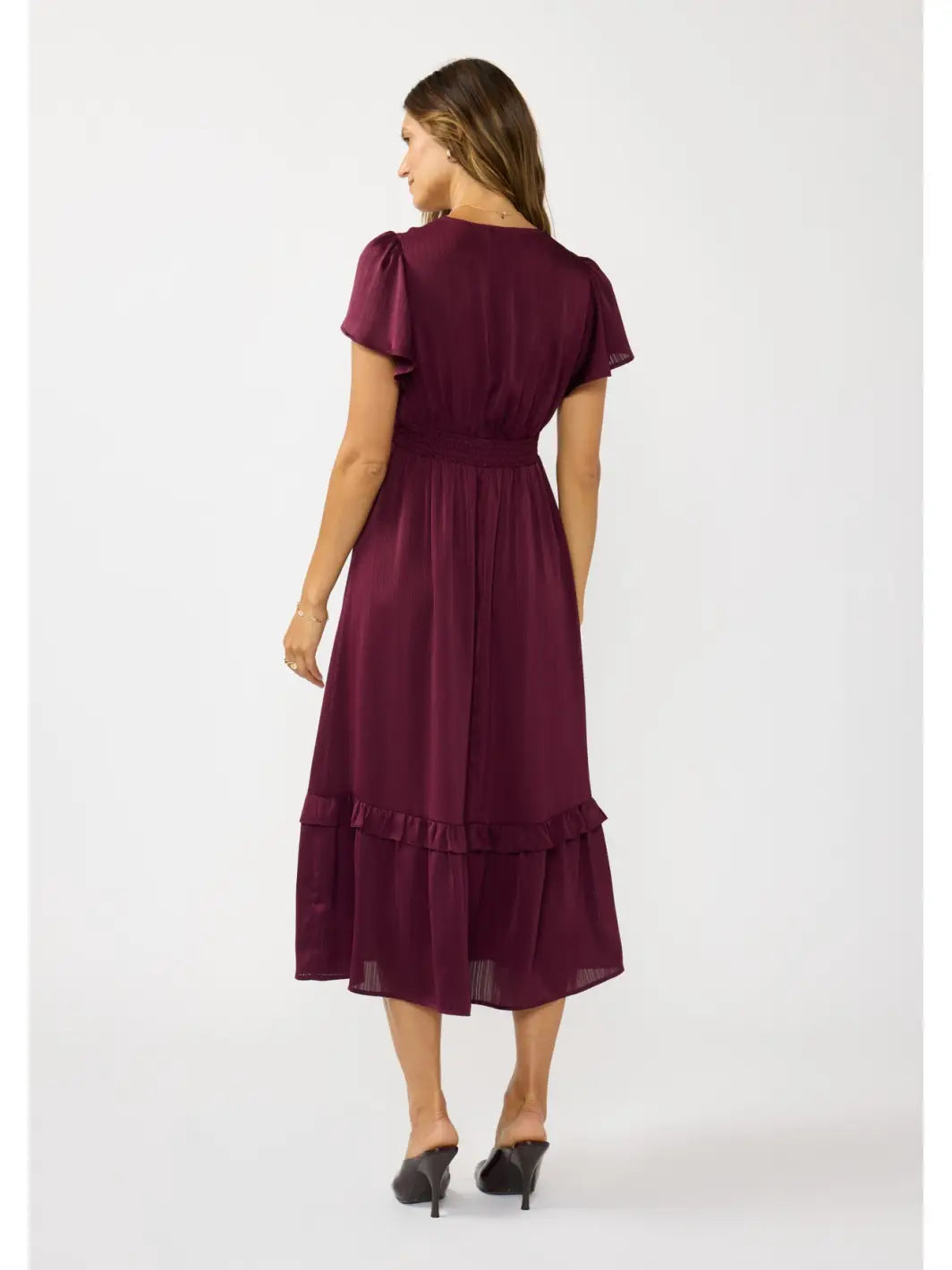 Chic and graceful, this midi dress is crafted from elegant satin stripe fabric for a soft, flowing drape. The flattering V-neckline leads into flutter sleeves, adding airy movement, while the back waist features smocking for a comfortable, figure-enhancing fit. A double self waistband and shirring at the front create gentle volume through the skirt, which finishes with a ruffled tiered hem for a touch of romance. The mid-length design makes it a versatile choice for both casual days and special occasions.
