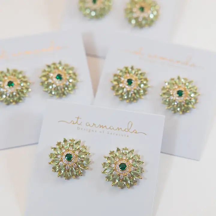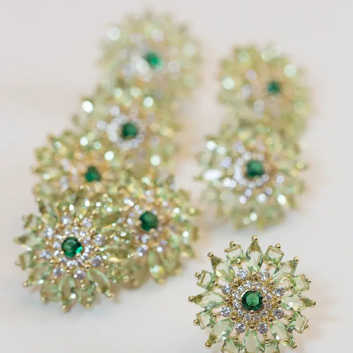 Inspired by the lush, layered petals of a dahlia in full bloom, these 1" radiant statement studs bring a fresh, romantic touch to any spring look. Faceted crystal petals shimmer in soft, luminous tones, surrounding a rich center stone for a dimensional floral silhouette that feels joyful and bold. Perfect for spring events, brunch dates, and adding a bright pop to your seasonal wardrobe.