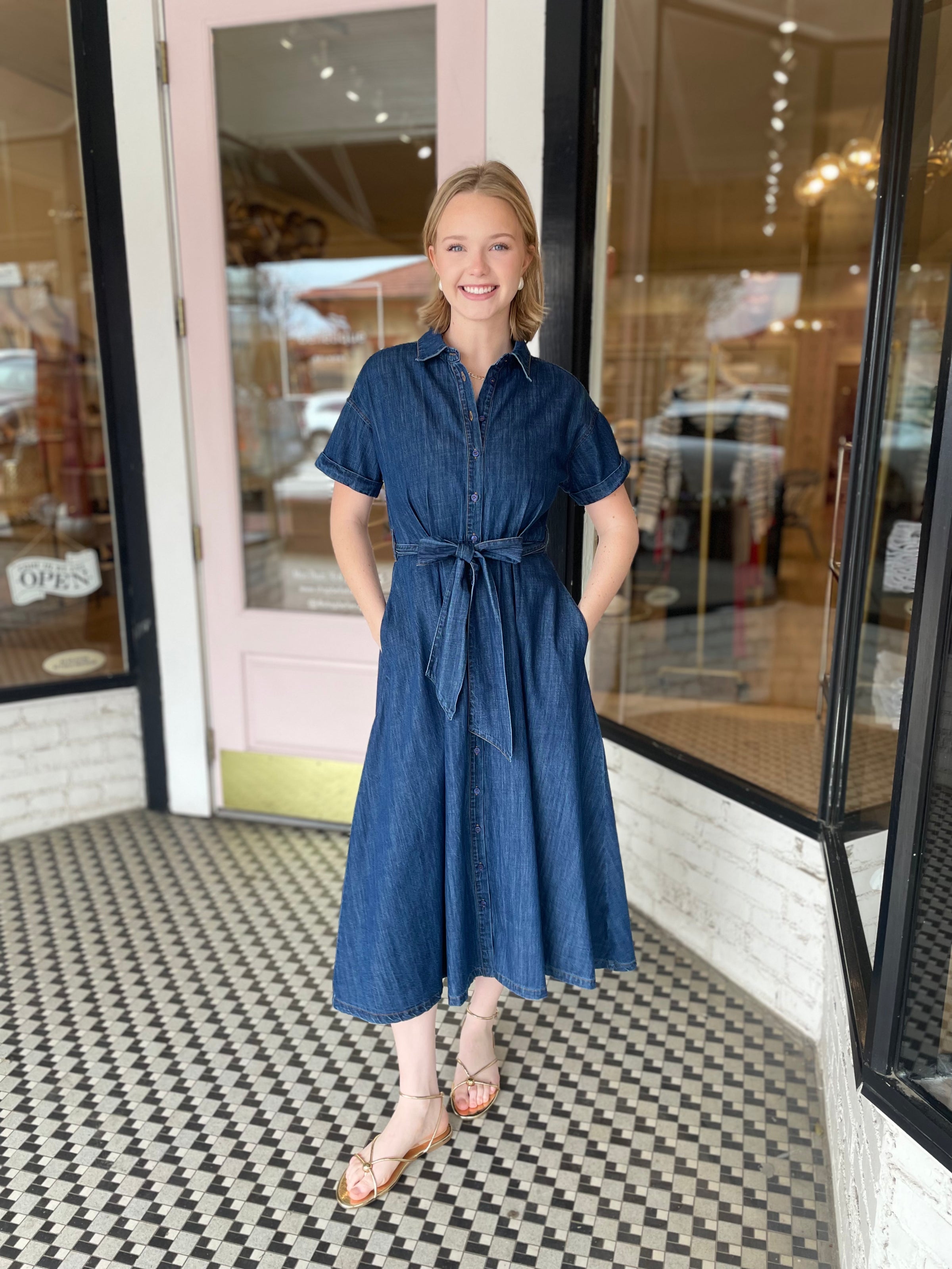 A classic denim belted dress. Perfect with sandals or boots.