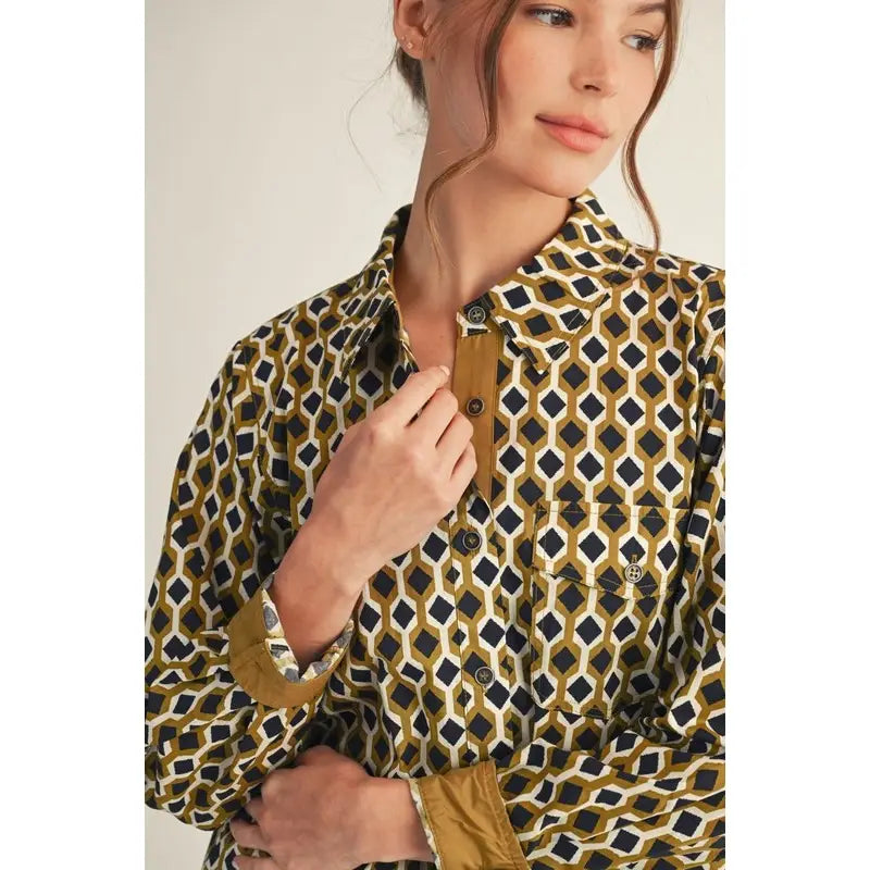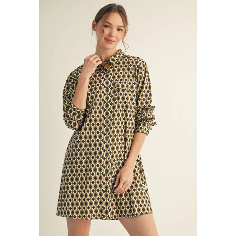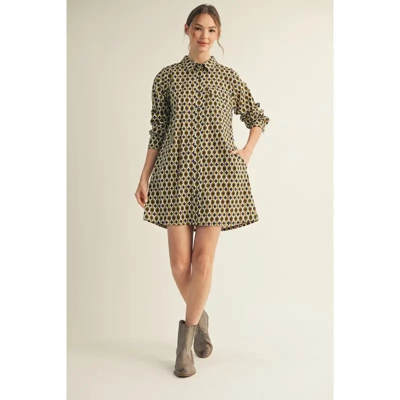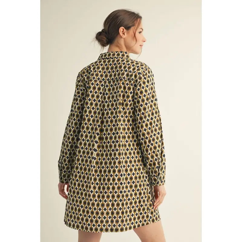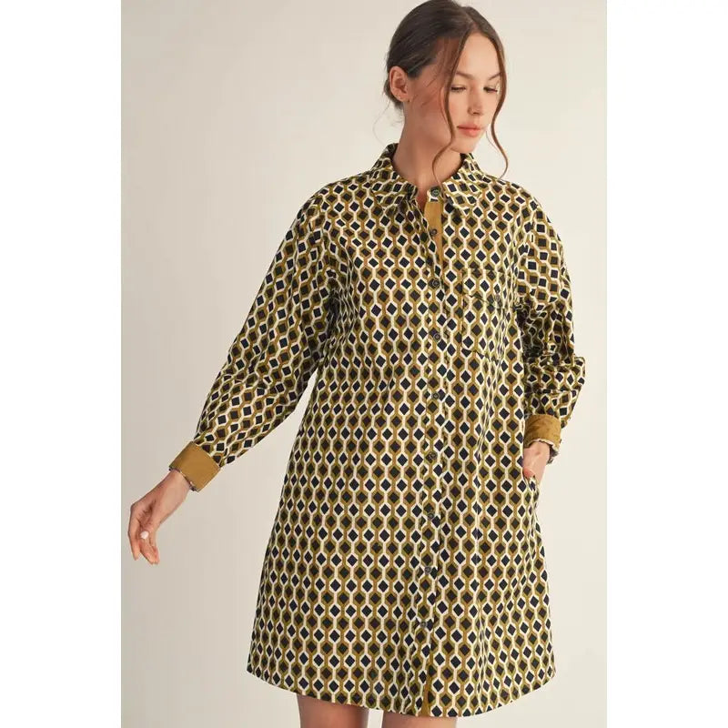 Long sleeves button down geometric prints shirt dress with side pockets.